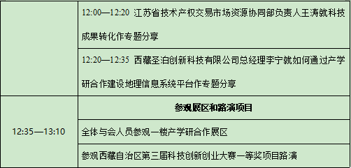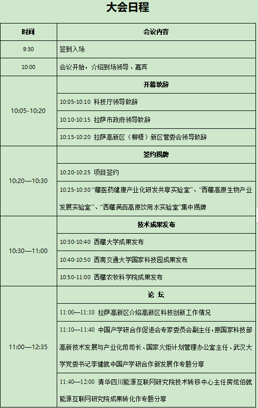大会包括开幕致辞、项目签约、实验室集中揭牌、技术成果发布、论坛、展区展示等主要环节内容,特别邀请了中国产学研合作促进会、西部双创示范基地联盟理事长单位、江苏省技术产权交易市场、西南交通大学、北京大学创业训练营西藏众创空间、南开大学创业创新基地、西藏大学、西藏民族大学、西藏农牧学院、西藏农牧科学院等区内外著名创新机构的专家学者,原国家科技部高新技术发展与产业化司司长、国家火炬计划管理办公室主任、国家科技部副秘书长、武汉大学党委书记,现任中国产学研合作促进会专家委员会副主任、武汉大学中国产学研合作问题研究中心首席科学家李健先生将在论坛环节就中国产学研合作新发展作专题分享,清华四川能源互联网研究院技术转移中心主任房炫伯、江苏省技术产权交易市场资源协同部负责人王涛等专家也将分别做精彩分享。