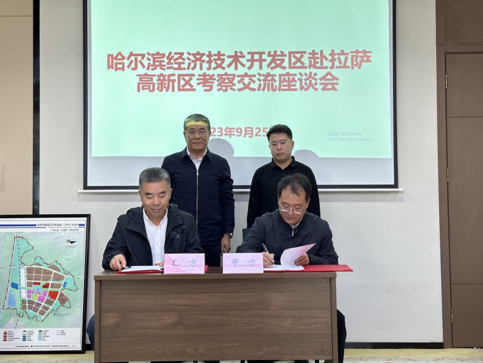 9月25日,哈尔滨经开区(平房区)开放招商工作领导小组常务副组长(正局长级)关和东一行3人赴拉萨高新区考察交流,拉萨高新区党工委委员、管委会副主任朱胜军受管委会主任达瓦次仁委托参加签约仪式。