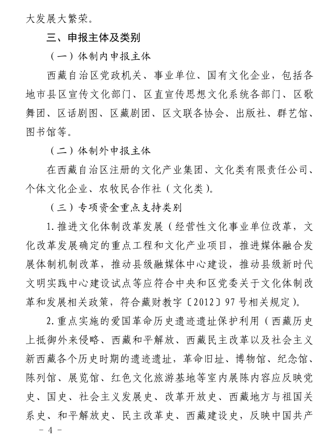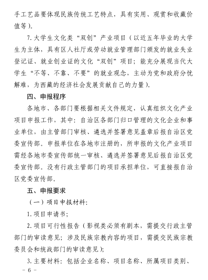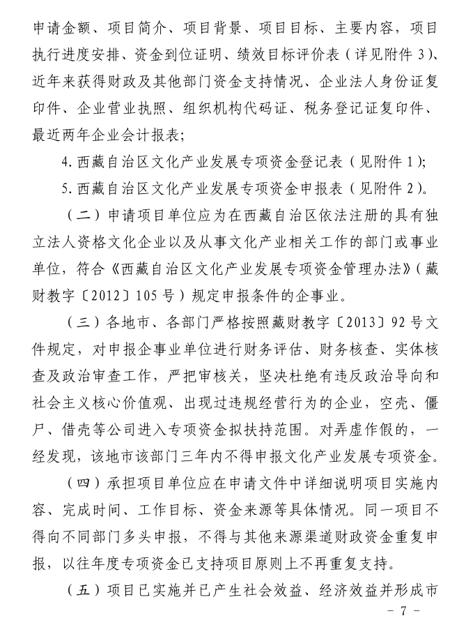1.申报单位应按照《西藏自治区文化产业扶持项目管理暂行办法》(藏财教字〔2012〕97号)、《西藏自治区文化产业发展专项资金管理暂行办法》(藏财教字〔2012〕105号)和《西藏自治区财政厅、西藏自治区党委宣传部关于申报自治区文化产业发展专项资金的补充通知》(藏财教字〔2013〕92号)(见中国西藏新闻网www.chinatibetnews.com、西藏日报)规定如实填报申报材料。
