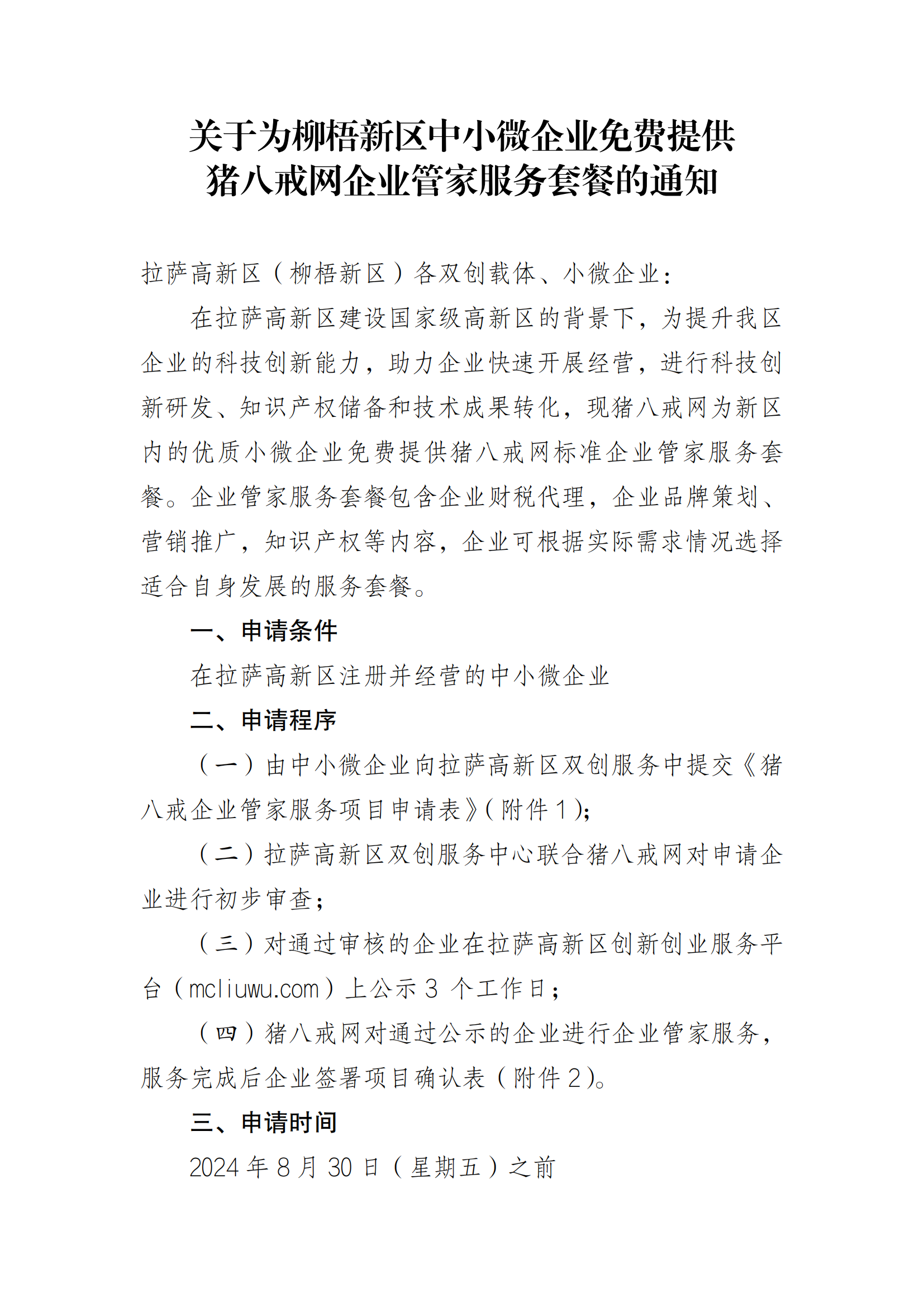 关于为柳梧新区中小微企业免费提供猪八戒网企业管家服务套餐的通知(2024年度)