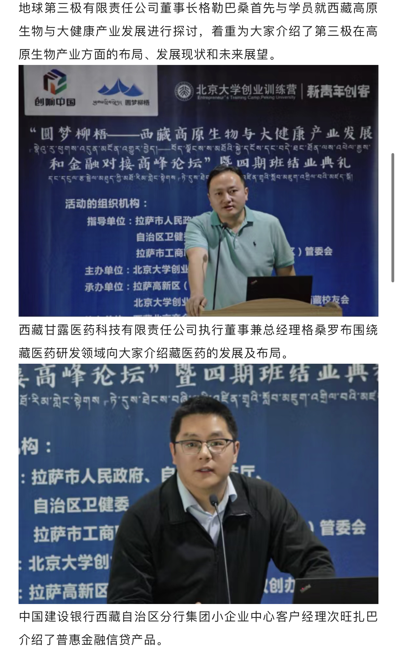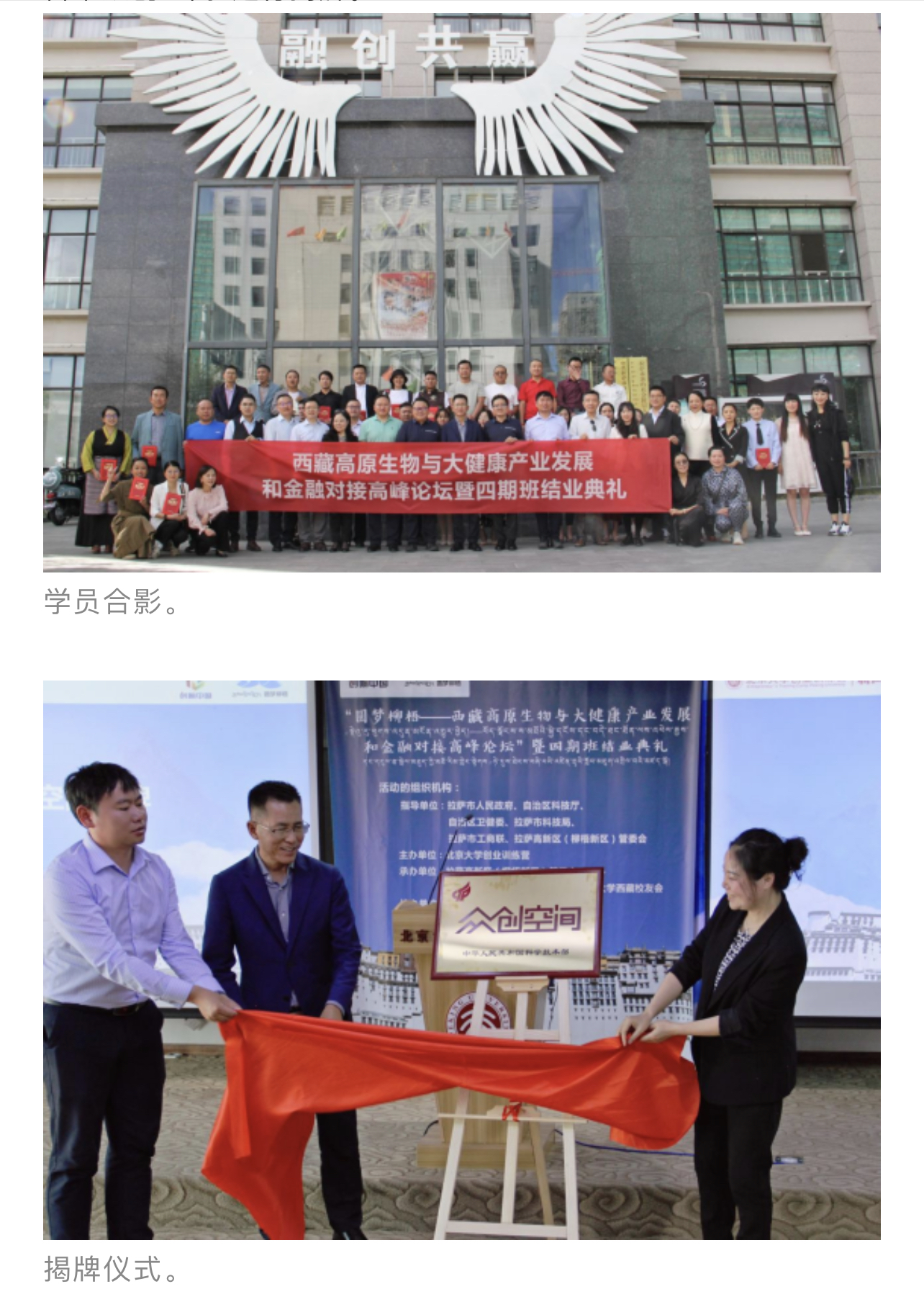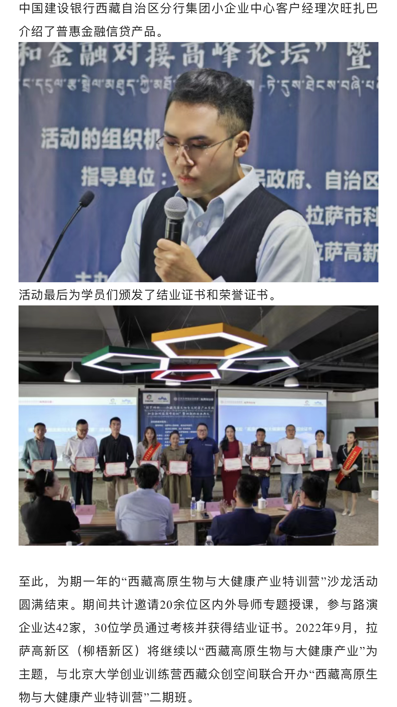 由拉萨高新区(柳梧新区)、北京大学创业训练营联合主办,拉萨高新区管委会双创办与北京大学创业训练营西藏基地共同承办的“圆梦柳梧——西藏高原生物与大健康产业发展和金融对接高峰论坛”于7月24日下午如期举行。至此为期一年的主题沙龙活动圆满结束。拉萨市人民政府副市长洛色,西藏自治区科技厅科创中心副主任文君,拉萨高新区(柳梧新区)管委会副主任白孜杨到场参加,并为北京大学创业训练营西藏众创空间获批“2021年国家备案众创空间”进行揭牌。