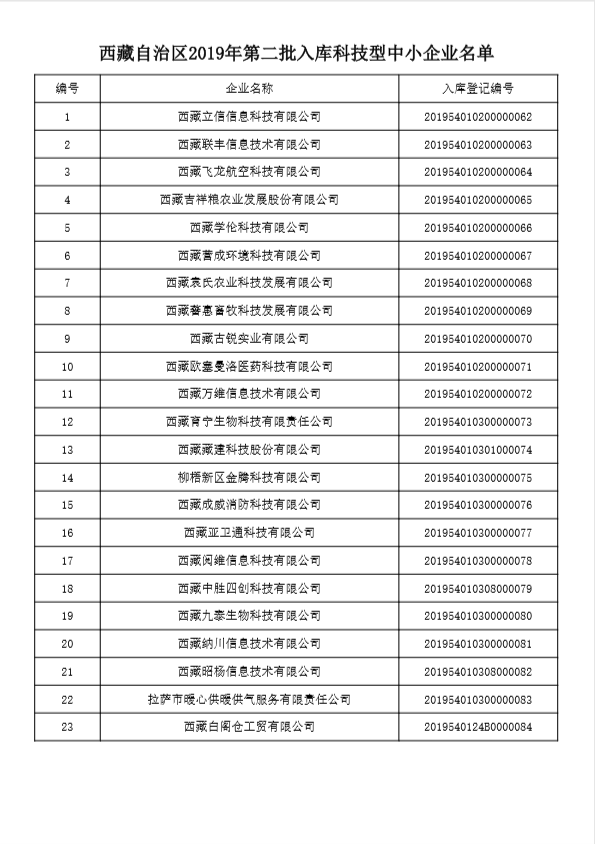 西藏自治区西藏自治区2019年第二批入库科技型中小企业名单公告