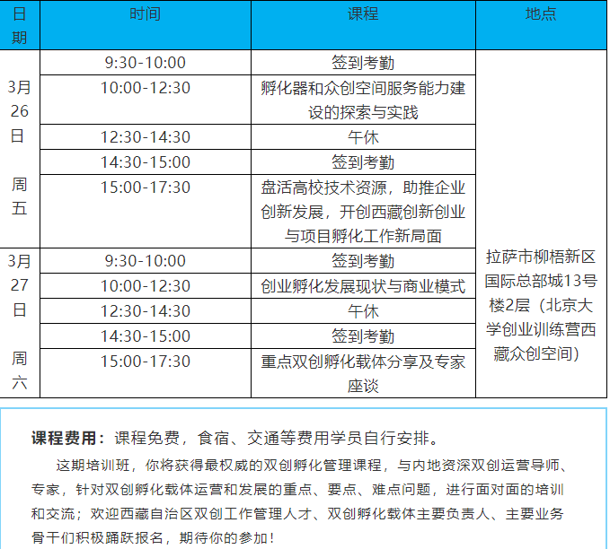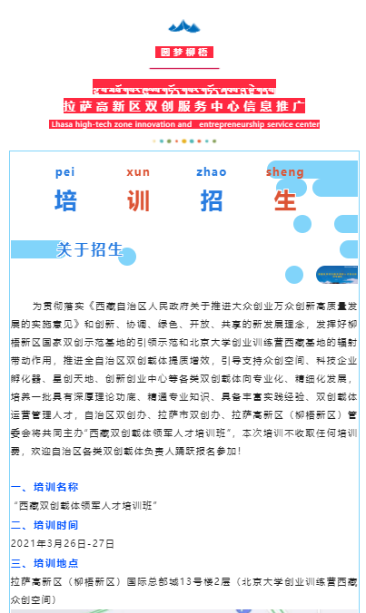 为贯彻落实《西藏自治区人民政府关于推进大众创业万众创新高质量发展的实施意见》和创新、协调、绿色、开放、共享的新发展理念,发挥好柳梧新区国家双创示范基地的引领示范和北京大学创业训练营西藏基地的辐射带动作用,推进全自治区双创载体提质增效,引导支持众创空间、科技企业孵化器、星创天地、创新创业中心等各类双创载体向专业化、精细化发展,培养一批具有深厚理论功底、精通专业知识、具备丰富实践经验、双创载体运营管理人才,自治区双创办、拉萨市双创办、拉萨高新区(柳梧新区)管委会将共同主办“西藏双创载体领军人才培训班”,本次培训不收取任何培训费,欢迎自治区各类双创载体负责人踊跃报名参加!