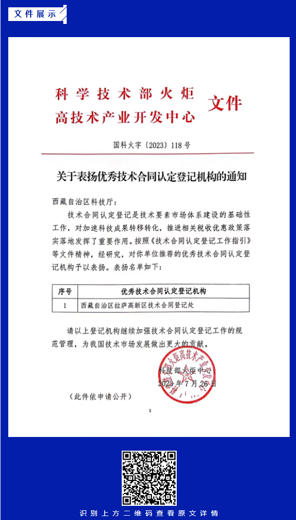 技术合同认定登记是技术要素市场体系建设的基础工作,对加速科技成果转移转化,推进相关税收优惠政策落实落地发挥了重要作用。近日,科技部火炬中心发文对优秀技术合同认定机构予以表扬,西藏自治区拉萨高新区技术合同登记处上榜,是西藏自治区唯一获表扬登记处。
