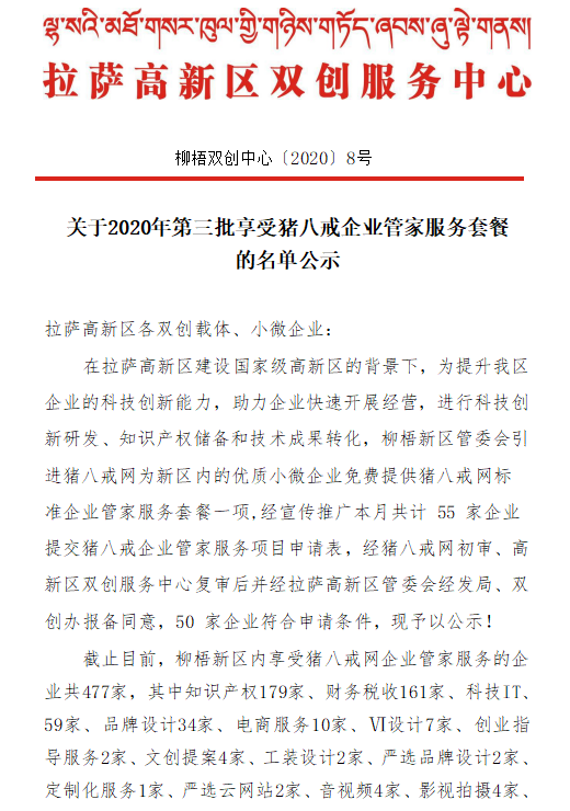 关于2020年第三批享受猪八戒企业管家服务套餐 的名单公示
