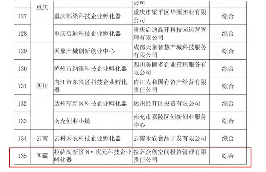 近日,科技部火炬中心对2021年度拟备案为国家级科技企业孵化器的149家机构进行了公示。拉萨高新区(柳梧新区)“N·次元”科技企业孵化器顺利通过公示,成为拉萨市首家获批国家级科技企业孵化器。