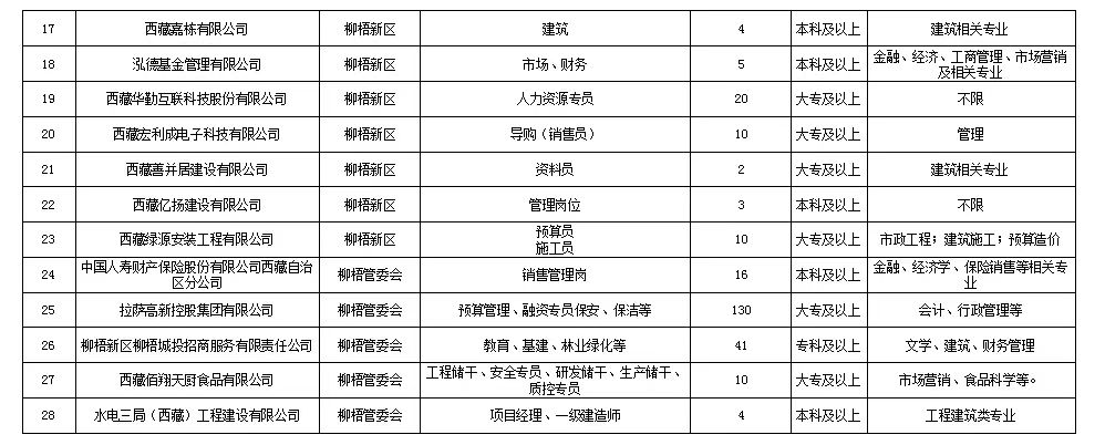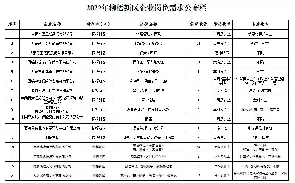 近期,拉萨高新区(柳梧新区)针对复工企业用工需求、务工人员待就业的实际情况,向辖区28家企业征集了一批岗位,共征集用工需求531名,将有效解决企业招工“进不来”和群众求职“出不去”的结构性矛盾,实现用工与就业供需双赢。具体岗位如下: