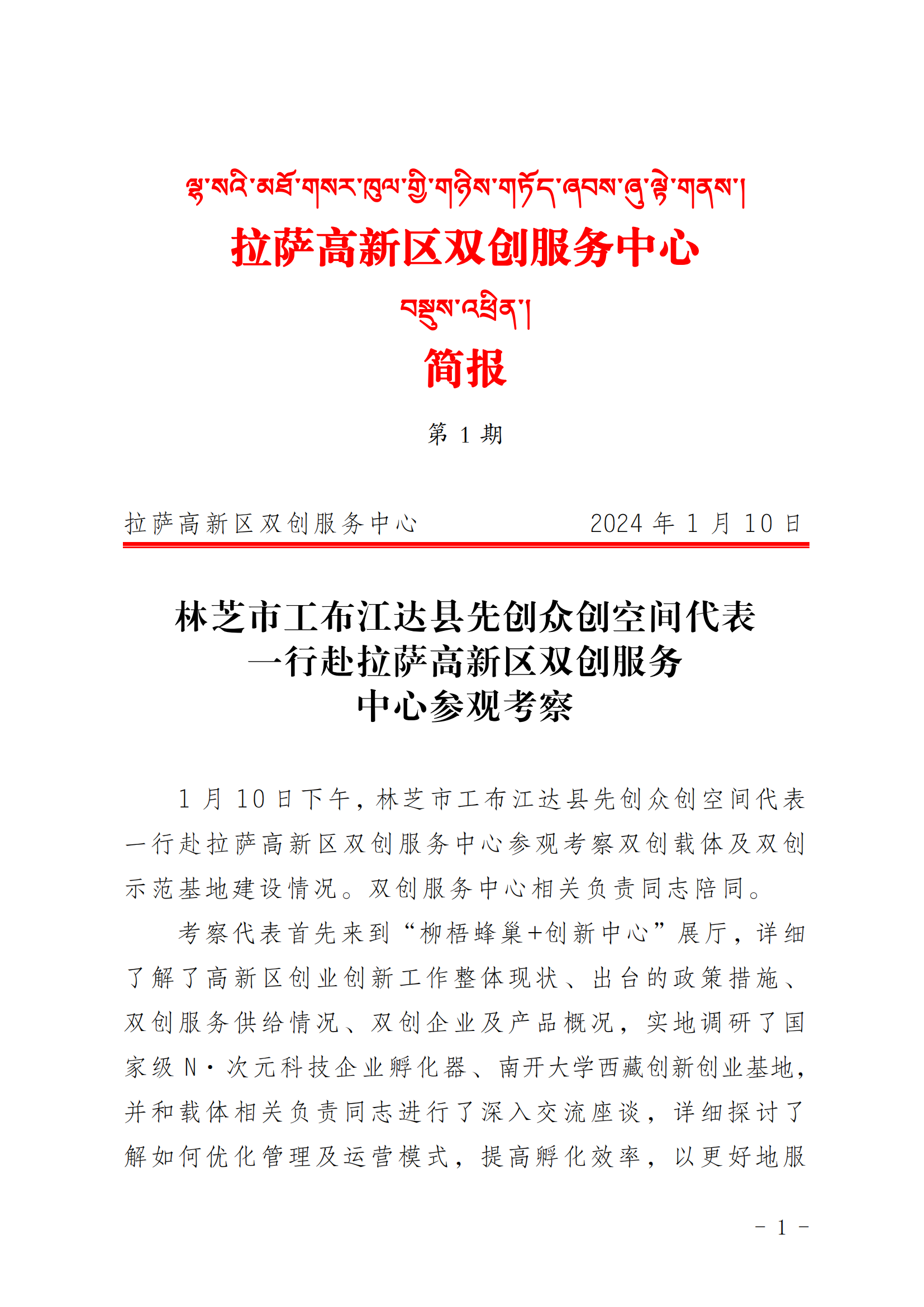 林芝市工布江达县先创众创空间代表一行赴拉萨高新区双创服务中心参观考察